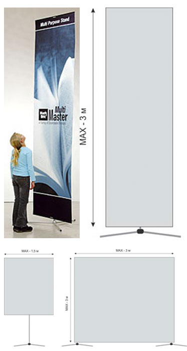 Опора раздвижная, универсальная. Материал — пластик алюминий. Опора отлично держит графические банеры (используется профиль Alu Rail) и простые панели, а также рамки Flexiframe. MultiMaster поражает своей высотой и замечательной устойчивостью.